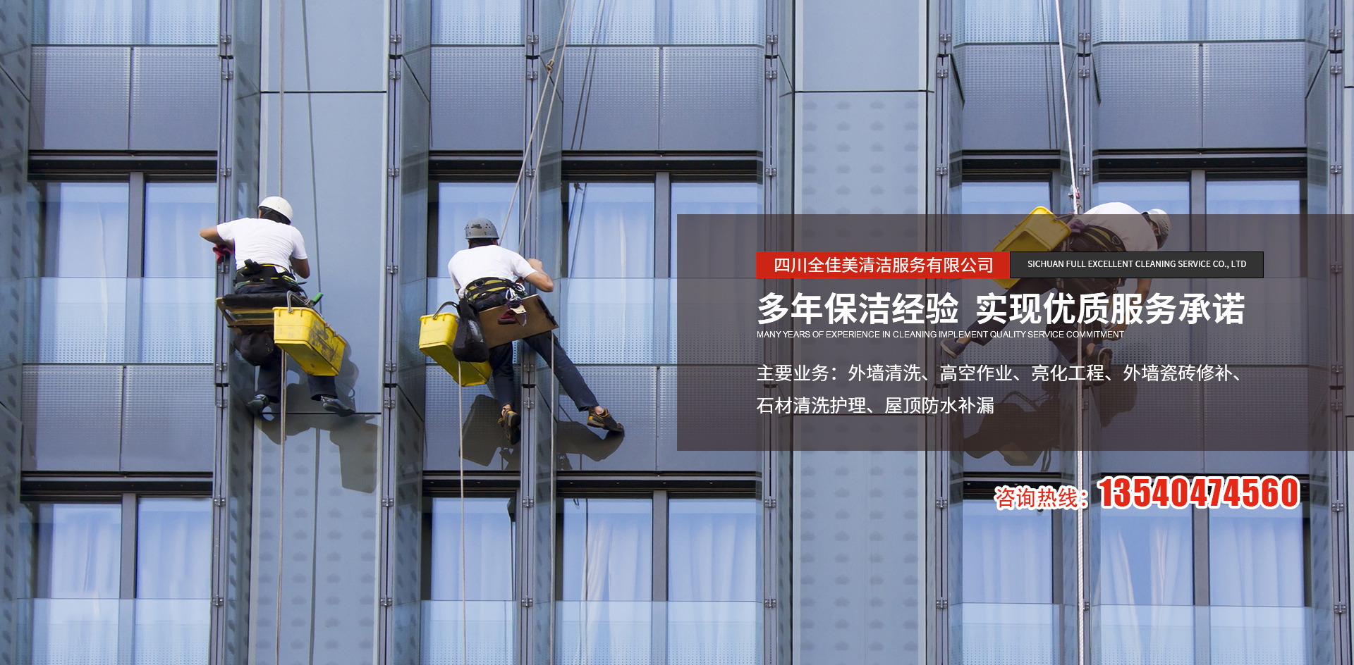 四川全佳美清潔服務(wù)有限公司成立于2017年11月20日,注冊(cè)資本200萬(wàn)元人民幣,是一家專業(yè)從事高空外墻清洗,外墻維修,開荒保潔,石材養(yǎng)護(hù),外墻防水等一體化的工程服務(wù)公司。公司先后服務(wù)于成都鐵路培訓(xùn)學(xué)校,雙流空港酒店,省體育館等寫字樓及工業(yè)園區(qū)的外墻清洗保潔及維修服務(wù)。經(jīng)過多年的發(fā)展與努力,公司已具備一定的規(guī)模及實(shí)力。現(xiàn)擁有一支技術(shù)精湛的服務(wù)團(tuán)隊(duì),以高標(biāo)準(zhǔn)的服務(wù)品質(zhì),專業(yè)的安全技術(shù)實(shí)力,為全川不同群體的客戶提供更安全,更周到的清洗服務(wù)解決方案,期待與你的合作。